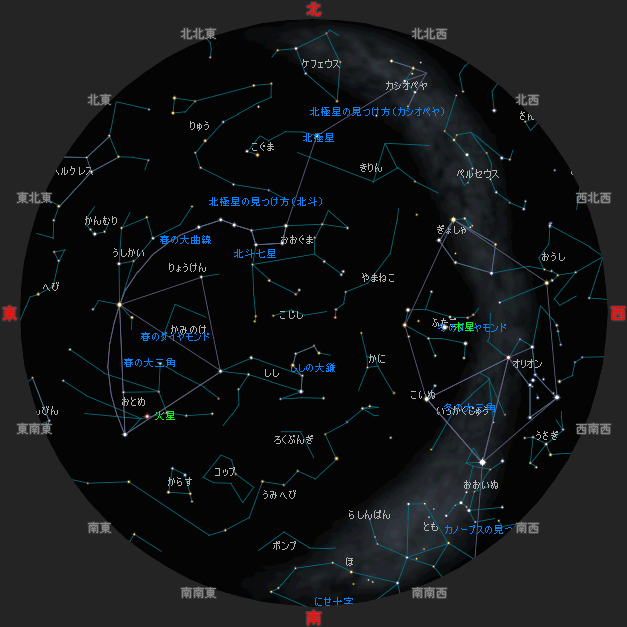 ☆ 星図の作成は アストロアーツ マルチメディア天文シュミレーション ステラナビゲータ を使用しております。 ☆ 詳しい星空ガイドは アストロアーツHP、月刊星ナビ、月刊天文ガイド 等を見てください。 ☆ 星空ガイドは、月刊星ナビ、月刊天文ガイド、天文年鑑 を参考に作成しました。 |