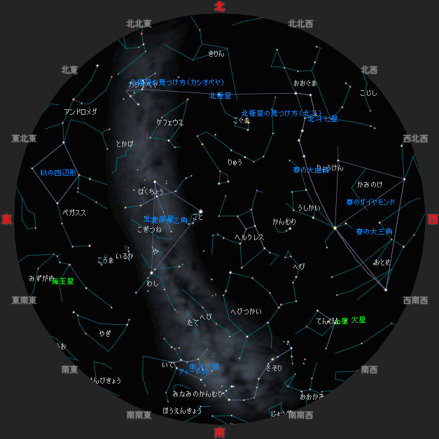 ☆ 星図の作成は アストロアーツ マルチメディア天文シュミレーション ステラナビゲータ を使用しております。 ☆ 詳しい星空ガイドは アストロアーツHP、月刊星ナビ、月刊天文ガイド 等を見てください。 ☆ 星空ガイドは、月刊星ナビ、月刊天文ガイド、天文年鑑 を参考に作成しました。 |