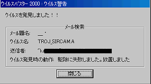 昨夜は初めて私のところにウィルス付きのメールがやってきました。 ウィルスバスターの駆除の仕方が分からないのです、正常なメールが受信できないのです(^^; この忙しい時にウィルスを送るな・・・親戚のK氏(プンプン怒っています) 明日の締切りの原稿がたぶん1.3MBの中にあると思うと気だけがあせっています。 SANNET(プロバイダ)のサポートセンターに連絡したら、「nPOPと言うソフトでメールサーバー内のウィルス添付メールを削除してください」とのことで、電話でソフトのダウンロードから削除の仕方まで親切丁寧に教えていただけました(^^) 土曜日までサポートしてくれるなんて、ほんとありがたいことですね。 午後1時過ぎに全てのメールが受信できてホッとしました、そして記念にここにウイルス警告表示を・・・ 今回は雑記帳のネタができたので迷惑メールも良しといたしましょう(^^) |