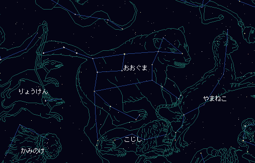 おおぐま座の7つの星を結ぶと、柄の付いた大きなひしゃく形になる。これを「北斗七星」と呼ぶ。α星、β星、γ星、δ星の4つがひしゃくの枡(ます)の部分、それに続くε星、ζ星、η星が柄の部分を表わす。