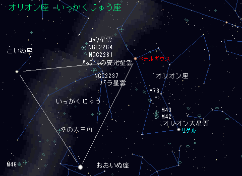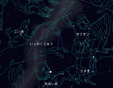 シリウスの東を流れる淡い冬の天の川の中にある、肉眼でも見える明るく美しい散開星団。双眼鏡でたいへん美しく眺められる。