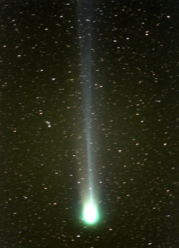 真っ直ぐに伸びた尾が100度以上(北天から南天まで)見えました。 明るさは、どの星よりも明るく、見事な大彗星になりました。