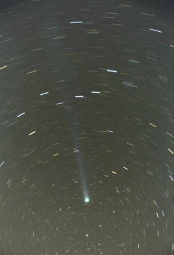 北極星付近から北斗七星 方向に尾が伸びていました。 28mm広角レンズに収まりきれませんでした。 北斗七星の大きさから、彗星の大さが良くわかると思います。