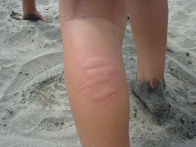 クラゲに刺された 長男の足 (痛そうです)
