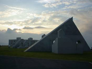 18世紀インドの日時計(手前) 17:30頃のモニュメントの風景です。 雲の多い天気でちょっと心配です。 |
