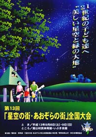 「星空の街・あおぞらの街」全国大会は、大気環境の保全について意識を高めるとともに、郷土の環境を活かした地域おこしの推進に役立てることを目的として行われるものであり、本大会は平成元年度から毎年開催しており、今回は第13回大会でした。 本年度は、9月8日・9日の両日に、環境省、群馬県及び「星空の街・あおぞらの街」全国協議会の主催によって、高円宮同妃両殿下御臨席の下、群馬県高山村において開催されました。 本大会では、大気保全への啓発・普及や全国星空継続観察等において優れた活動を行った団体・個人に対して環境大臣賞の授与などを行われました。 |