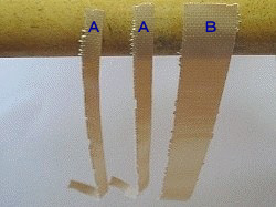 ガムテープを Aのように5mm幅のものを数本 Bの20mm幅のものを1本用意する。 |