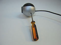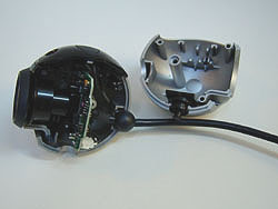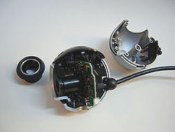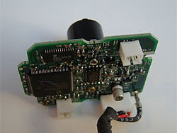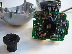レンズユニット(ピント調整用ネジ)をくるくる回すと簡単に取れ、CCDセンサーが見えてくる |