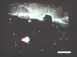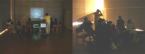 大島さんによる 3D天体画像のプレゼン メガネを通して見ると 星々・星雲が近くに遠くに見え子供たちは大喜びでした。 |