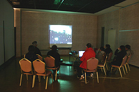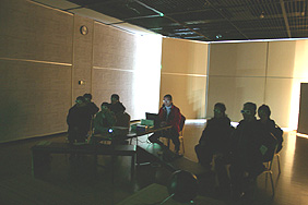 皆さん赤と青のメガネを着用し 立体写真に酔いしれています。 |