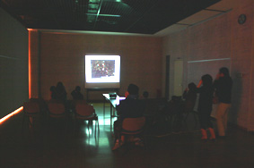 皆さん赤と青のメガネを着用し立体写真に酔いしれています。 |