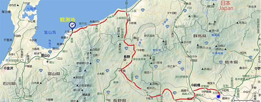 | もてぎ天文台 → 北関東道 太田桐生IC → 北陸道 黒部IC → 入善PA (観測地) → 太田桐生IC → もてぎ天文台 往復約670Km 燃費13.1km/L |